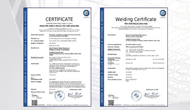 鋼結構制作、安裝一級資質,通過了ISO9001-2000質量管理體系的認證、ISO14000環境管理體系認證、ISO18000職業健康安全管理體系認證以及EN1090認證,美國AISC認證。客戶眾多